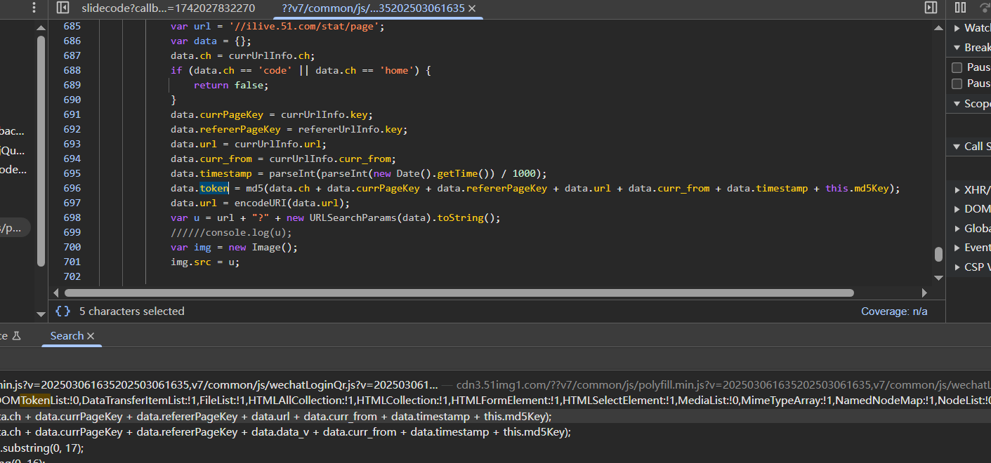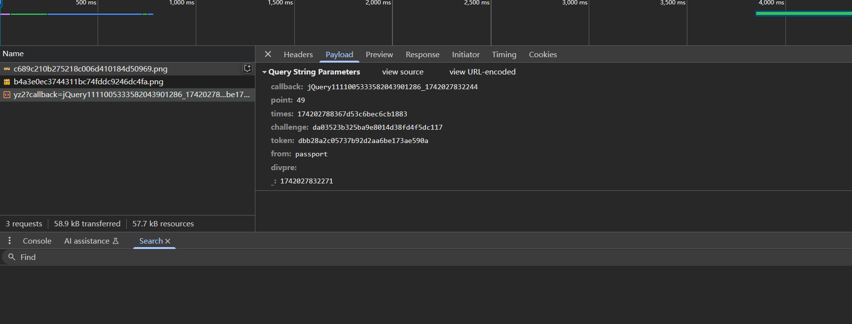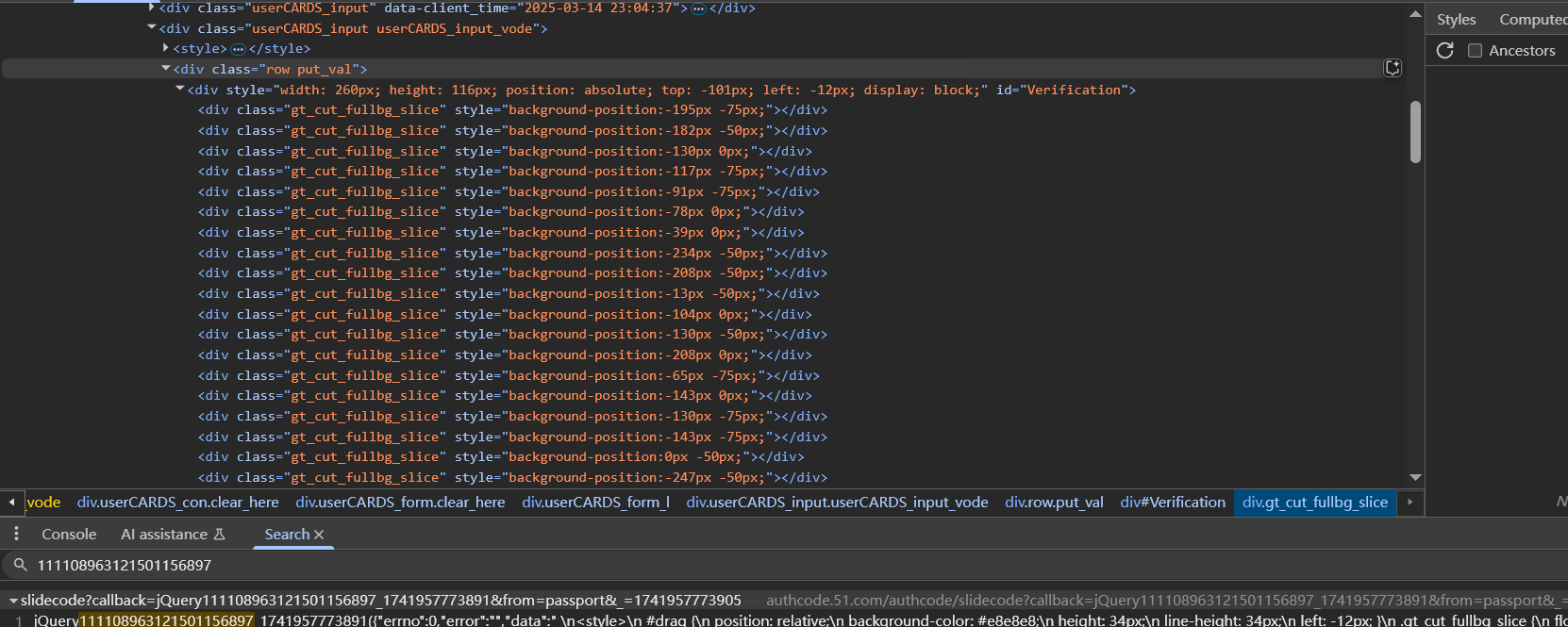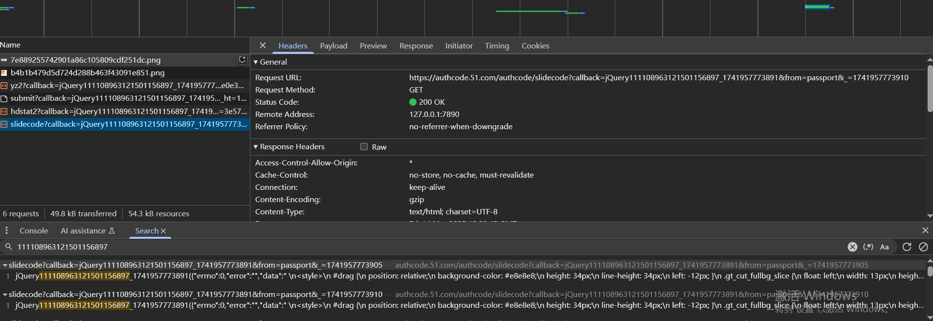 这个url怎么来的呢?继续看前面的数据包,全局搜索png的文件名也行,可以看到这个url实际上是请求https://authcode.51.com/authcode/slidecode?callback=jQuery111108963121501156897_1741957773891&from=passport&_=1741957773910这个url来的