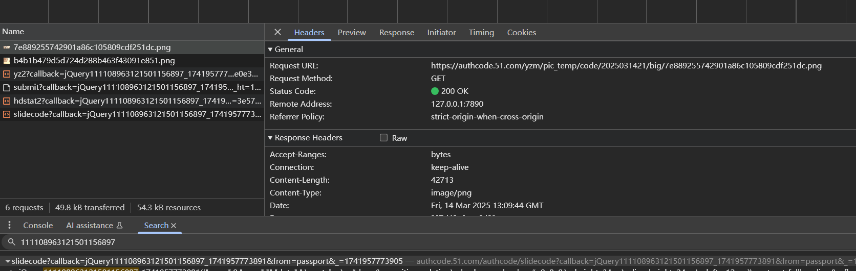 对于51滑块,可以看数据包,可以看到是请求https://authcode.51.com/yzm/pic_temp/code/2025031421/big/7e889255742901a86c105809cdf251dc.png这个url来获取图片的