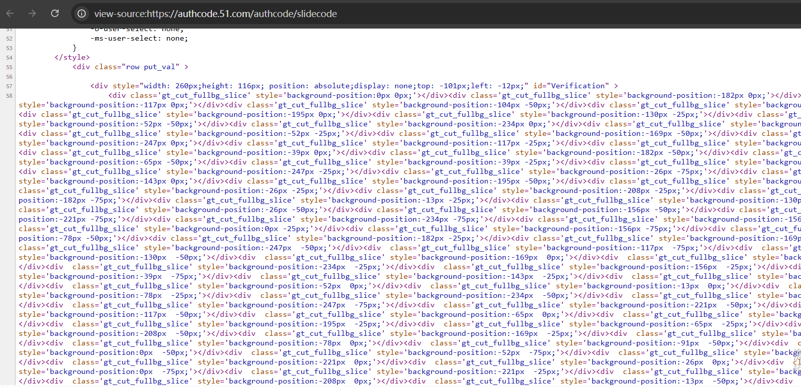 然后去尝试这些参数是不是都需要,最后发现浏览器直接访问https://authcode.51.com/authcode/slidecode也可以获取到图片url,url在网页源码里,而且每次访问的时候返回的图片url都不一样