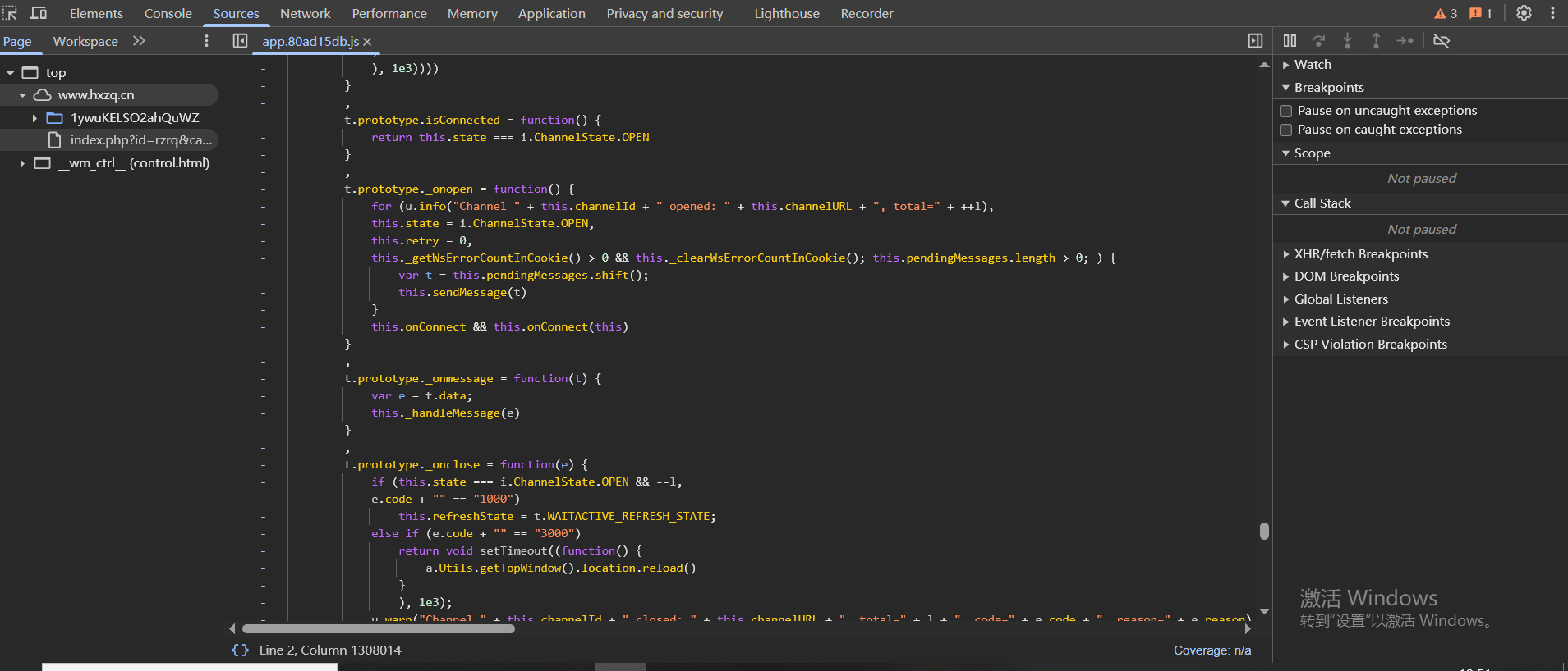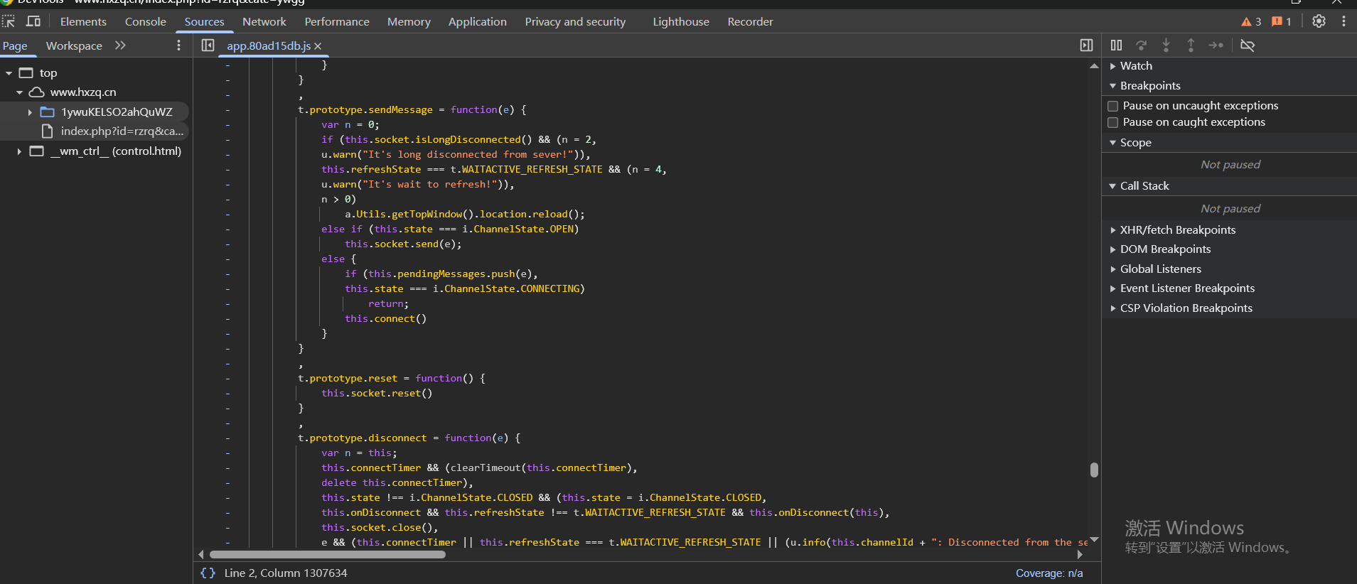 往下找找到onMessage函数,打上断点,可以看到断下来的时候,网页没有任何显示,这也说明在发送websocket请求之前,我们需要的数据是没有加载的