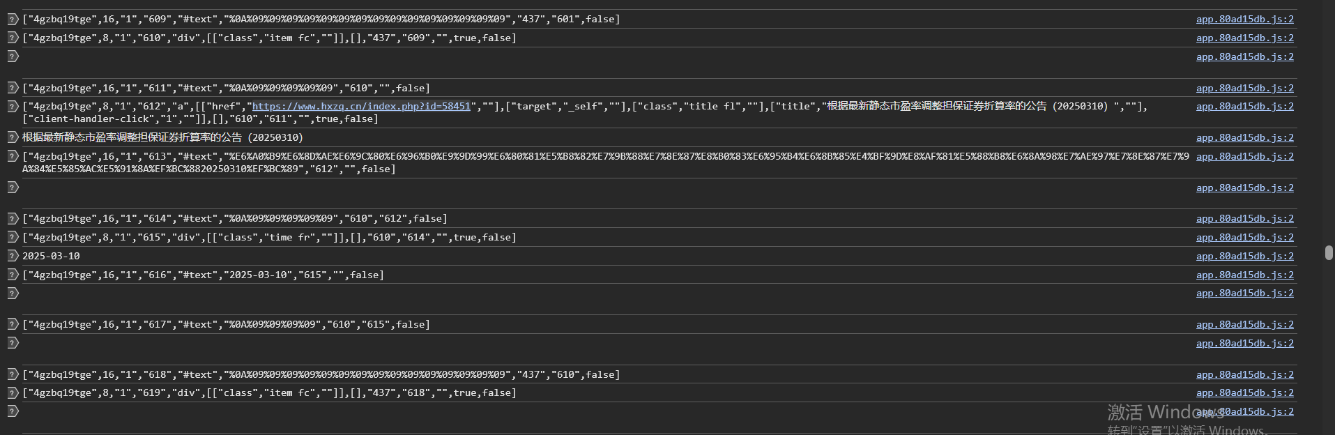 然后可以在控制台看到解码之后的数据,也就是我们需要的文章标题,还有文章的url
