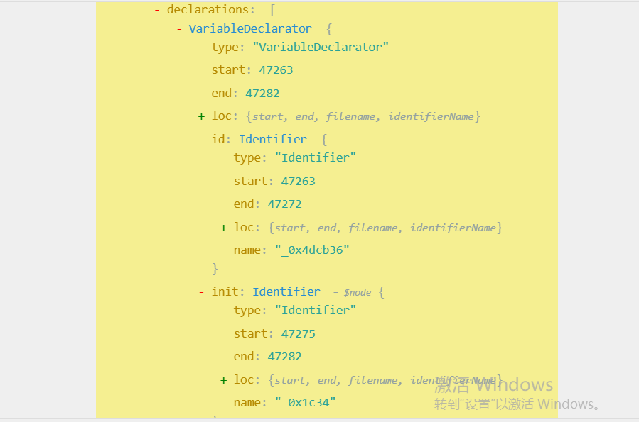 可以发现代码中函数的赋值语句是var _0x4dcb36 = _0x1c34,该类语句的AST是VariableDeclaration节点,里面有