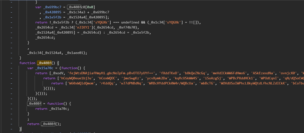 在源代码中找到该函数,然后保存到test.js中,代码的第一行var _0x408fc0 = _0x408f();调用了_0x408f函数,这个函数实际上是一个字符串数组