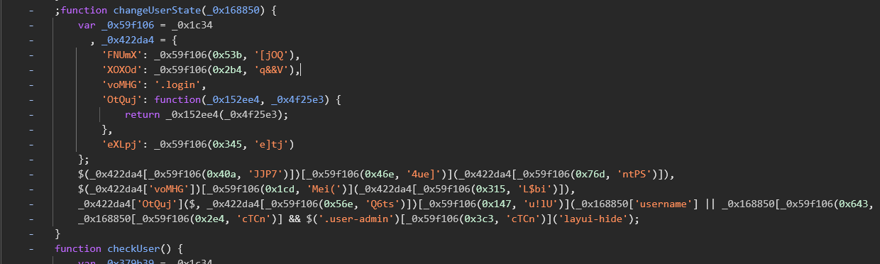 | function changeUserState(_0x168850) { var _0x59f106 = _0x1c34, _0x422da4 = { 'FNUmX': ".logout", 'XOXOd': "layui-hide", 'voMHG': '.login', 'OtQuj': function (_0x152ee4, _0x4f25e3) { return _0x152ee4(_0x4f25e3); }, 'eXLpj': ".username" }; $(".logout")["removeClass"]("layui-hide"), $(".login")["addClass"]("layui-hide"), _0x422da4['OtQuj']($, ".username")["text"](_0x168850['username'] || _0x168850["nickName"]), _0x168850["admin"] && $('.user-admin')["removeClass"]('layui-hide'); }