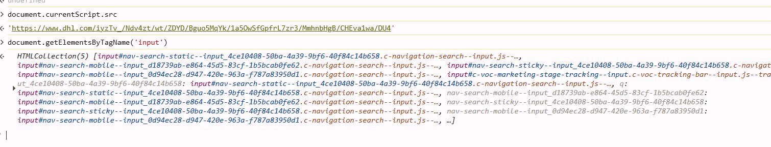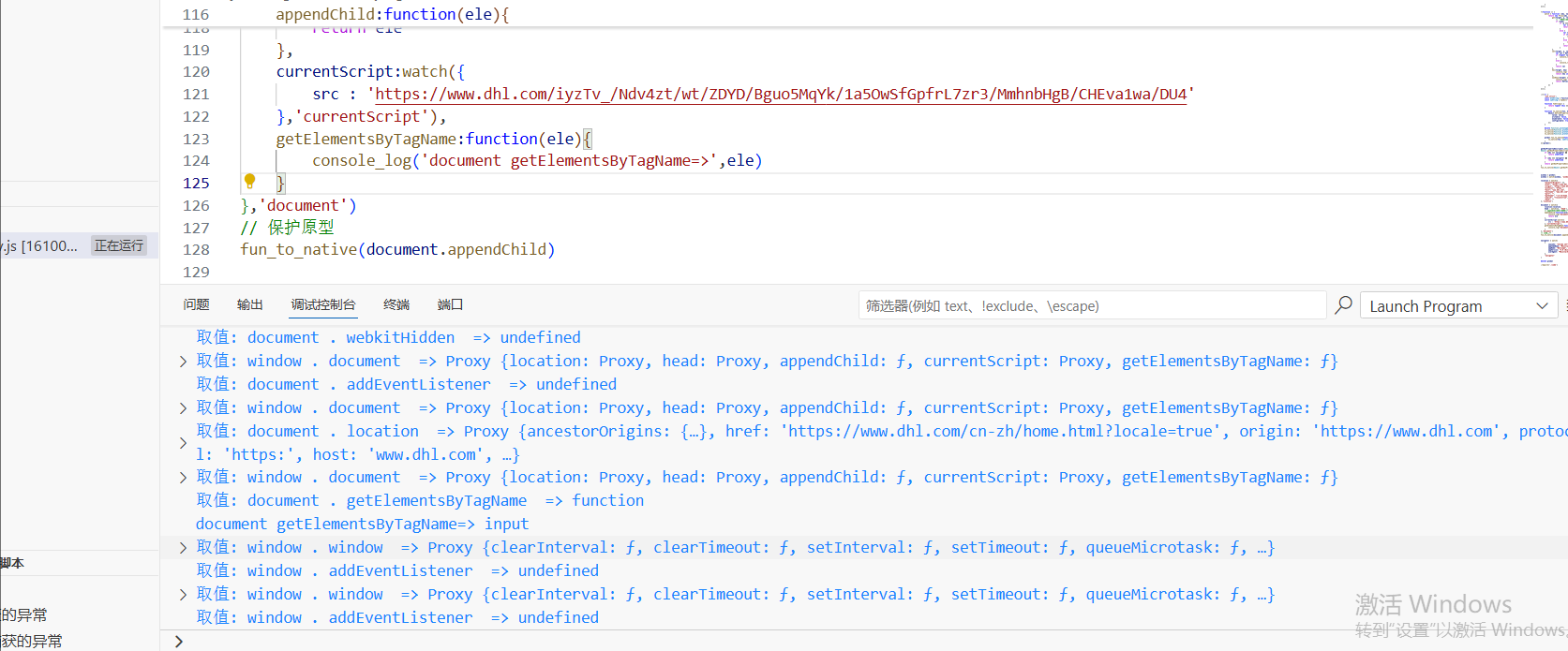 1 2 3 4 5 6 7 8 9 10 11 12 13 14 15 16 17 18 19 20 21 22 23 24 25 26 27 28 29 30 31 32 33 34 35 36 37 38 39 40 41 42 43 44 45 46 47 48 49 50 51 52 53 54 55 56 57 58 59 document = watch ({ location :location, head : watch ({}, 'head' ), appendChild :function (ele ){ console_log ('document appendChild=>' ,ele) return ele }, currentScript :watch ({ src : 'https://www.dhl.com/iyzTv_/Ndv4zt/wt/ZDYD/Bguo5MqYk/1a5OwSfGpfrL7zr3/MmhnbHgB/CHEva1wa/DU4' },'currentScript' ), getElementsByTagName :function (ele ){ console_log ('document getElementsByTagName=>' ,ele) if (ele === 'input' ){ return [] } }, createElement :function (ele ){ console_log ('document getElementsByTagName=>' ,ele) if (ele === 'p' ) { let p = watch ({ nodeType :1 },'p' ) return p } if (ele === 'span' ) { let p = watch ({ nodeName :'SPAN' },'span' ) return p } if (ele === 'div' ) { let p = watch ({ getElementsByTagName : function (ele ){ console .log ('div getElementsByTagName=>' ,ele) }, ATTRIBUTE_NODE : 2 , baseURI : 'https://www.dhl.com/cn-zh/home.html?locale=true' },'div' ) fun_to_native (p.getElementsByTagName ) return p } debugger }, getElementById :function (ele ){ console_log ('document getElementById=>' ,ele) debugger }, documentElement :watch ({ getAttribute :function (ele ){ console_log ('document documentElement getAttribute=>' ,ele) } },'documentElement' ), addEventListener :window .addEventListener , hidden : true , webkitHidden : true , cookie : 'cookieDisc...9rlW0X6Z27srwyerfFEQzI1TeX9L~1' , URL : 'https://www.dhl.com/cn-zh/home.html?locale=true' },'document' )