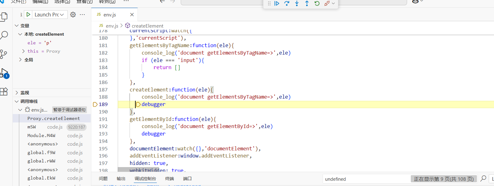 然后就是补createElement、getElementById、getElementsByTagName这种方法的时候可以下断点,看创建了什么标签或者拿什么标签