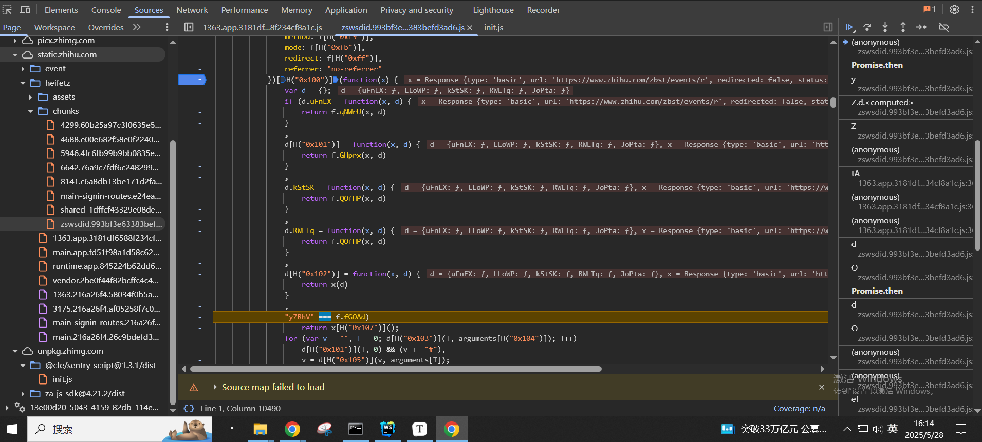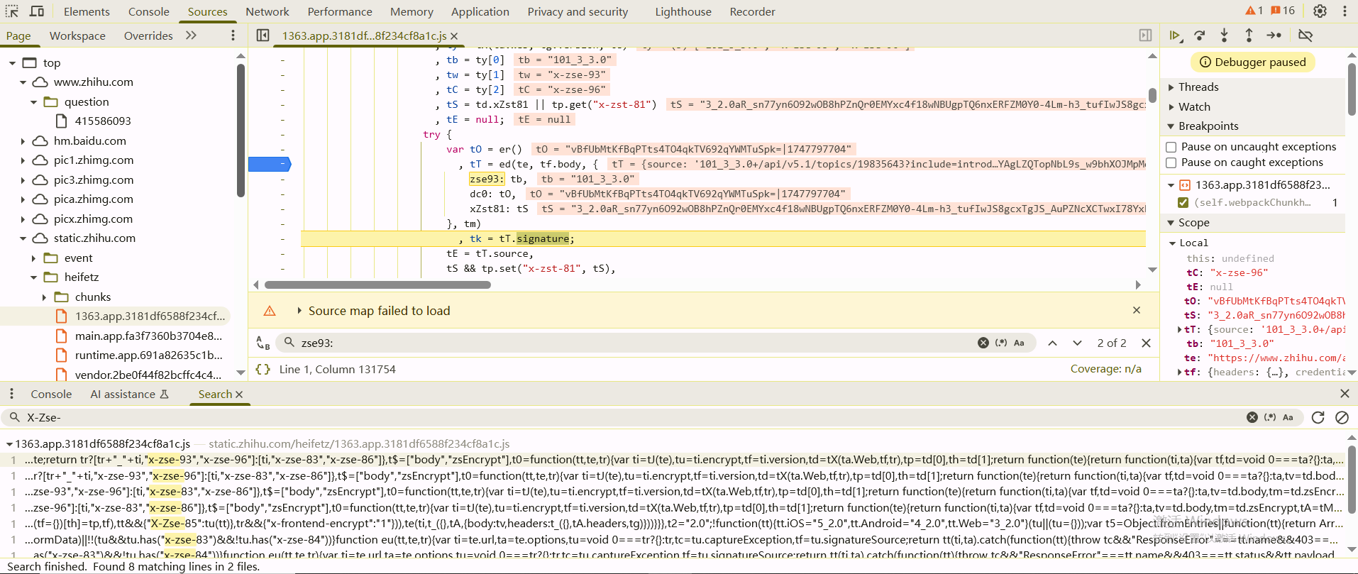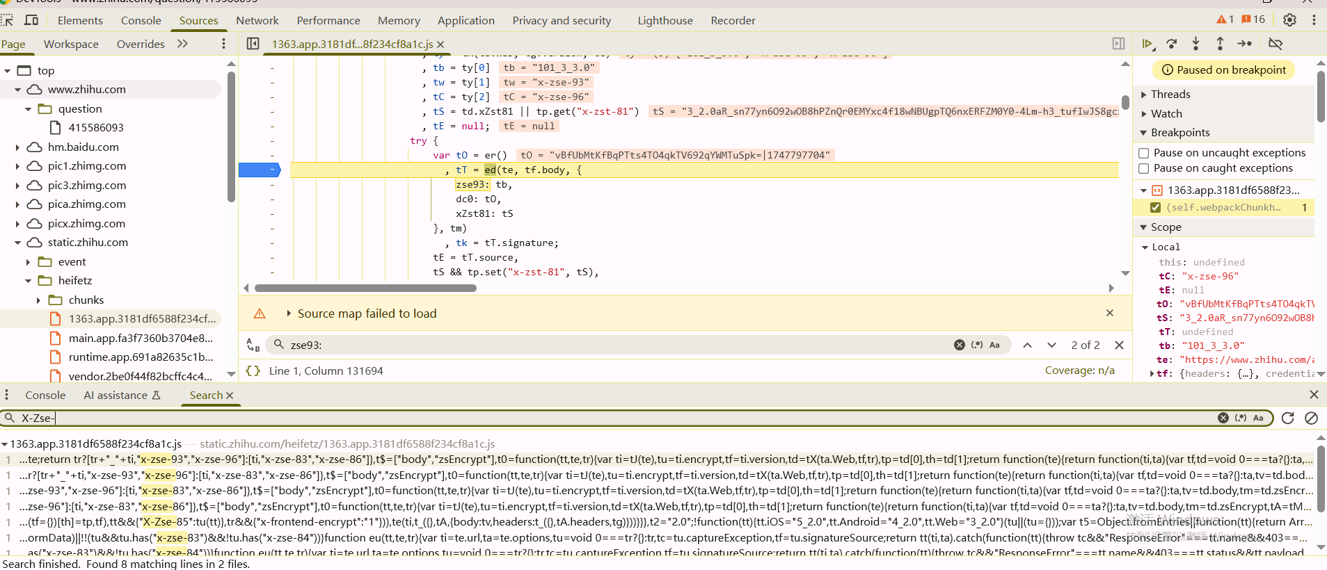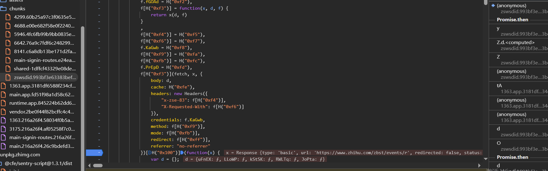 全局搜索"x-zst-81",把断点下在这里,当代码执行到这里的时候,发现在访问'/api/v4/me?include=is_realname'接口的时候,此时tS = td.xZst81 || tp.get("x-zst-81")获取不到值