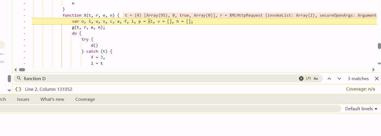 先把整个js的代码给扣下来,而且这牵涉到一个问题,就是这里的X函数是在vmp里面,没法像其他的逆向一样,有一整个加密函数,然后扣代码之后直接调用封装好的加密函数就行了,通过断点也可以验证这个猜想,断在X(e, this, arguments, r)之后,不是每次断点都是执行的加密的那一步