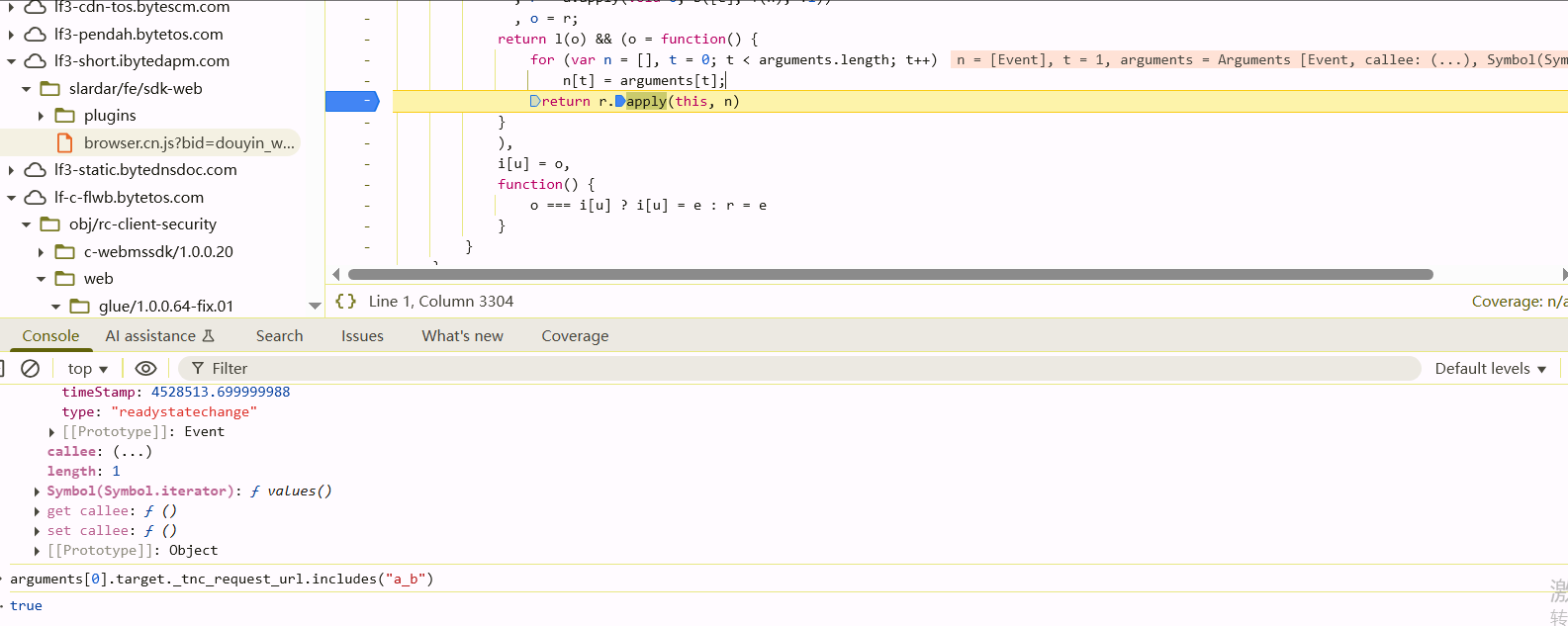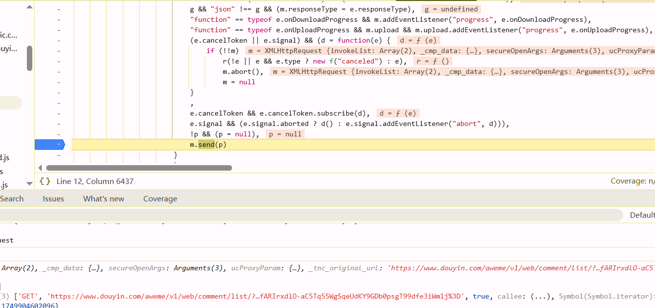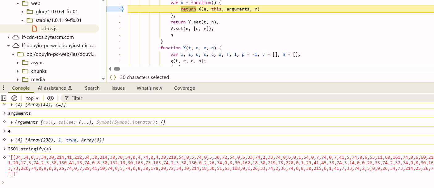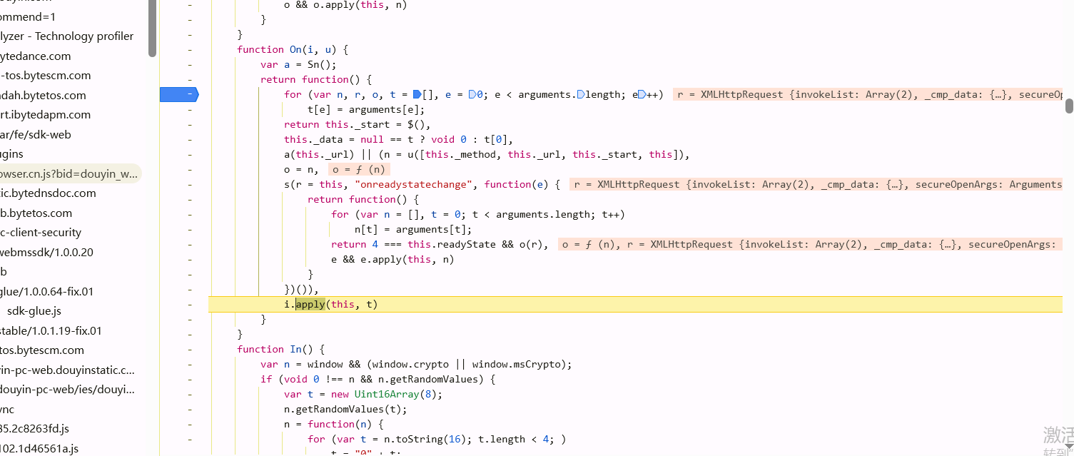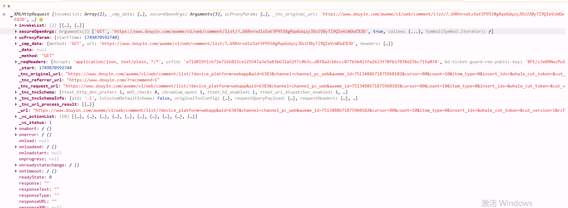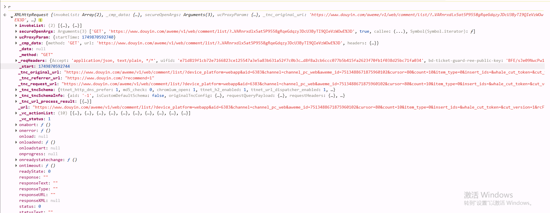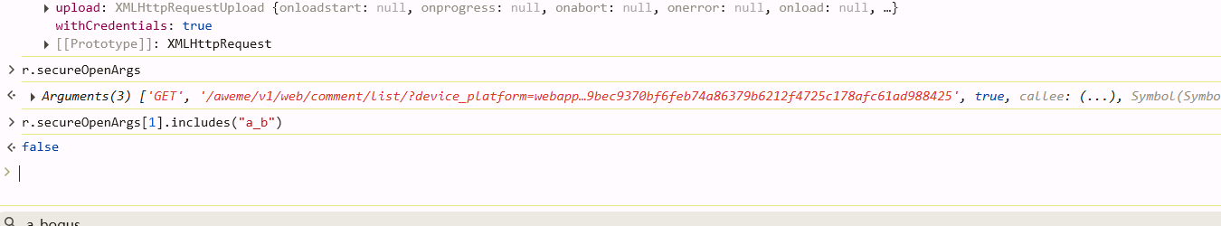 然后运行之后调试进入return X(e, this, arguments, r)这里,现在的问题是怎么拿到返回值,通过调试可以发现,当return X(e, this, arguments, r)被调用之后,this(也就是this,XMLHTTPRequest的实例)的secureOpenArgs的值中就会携带了ab参数