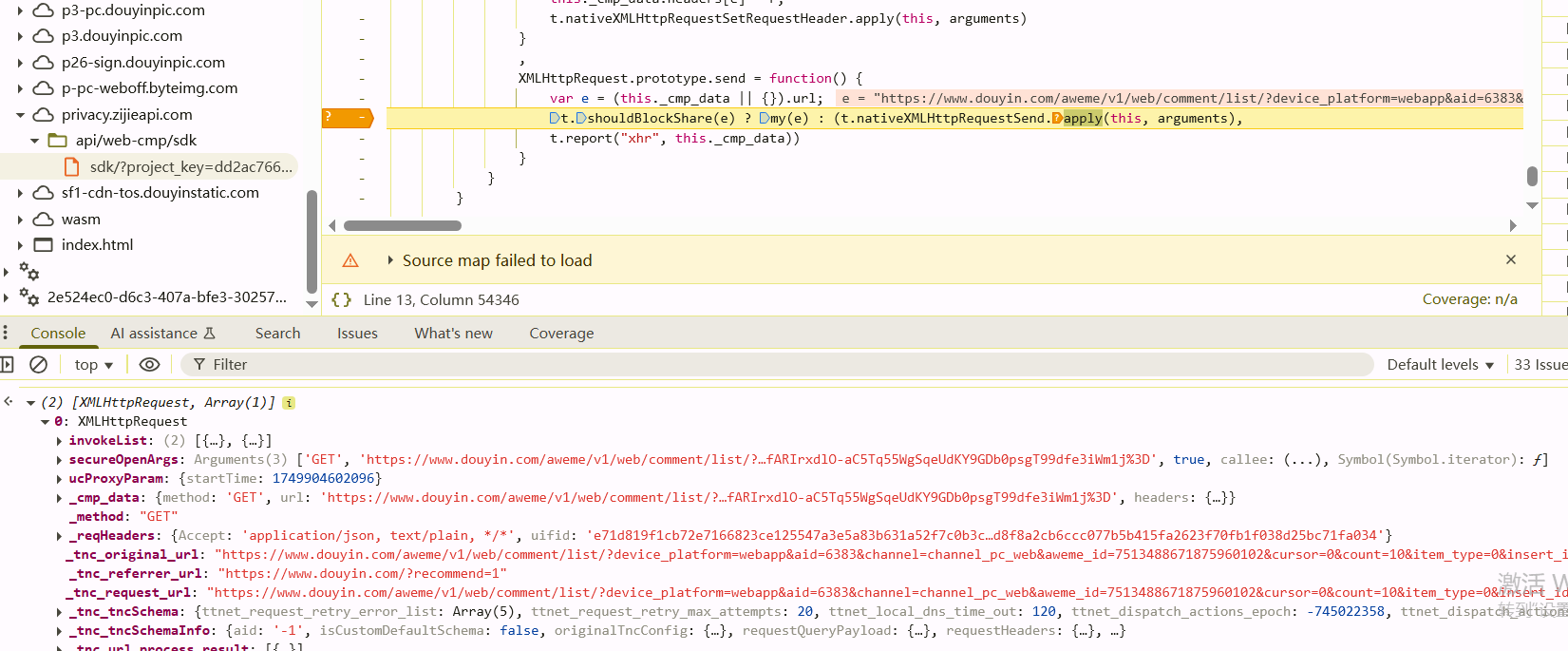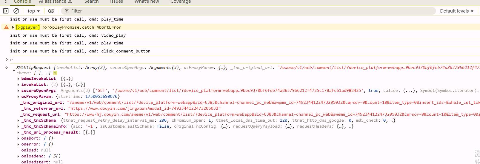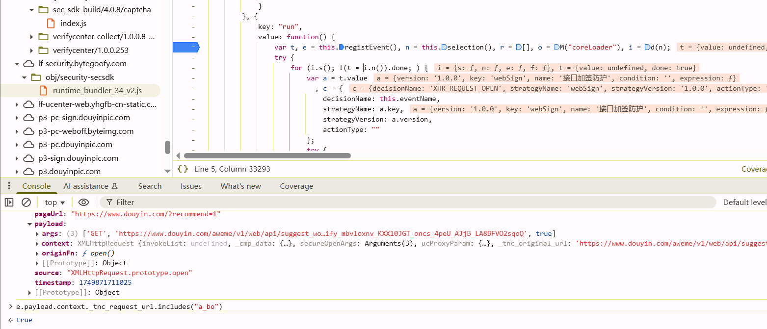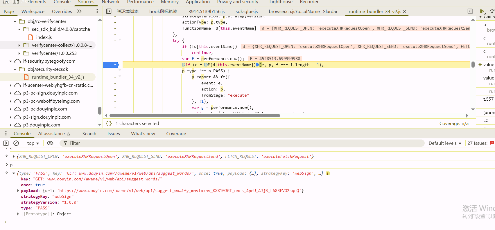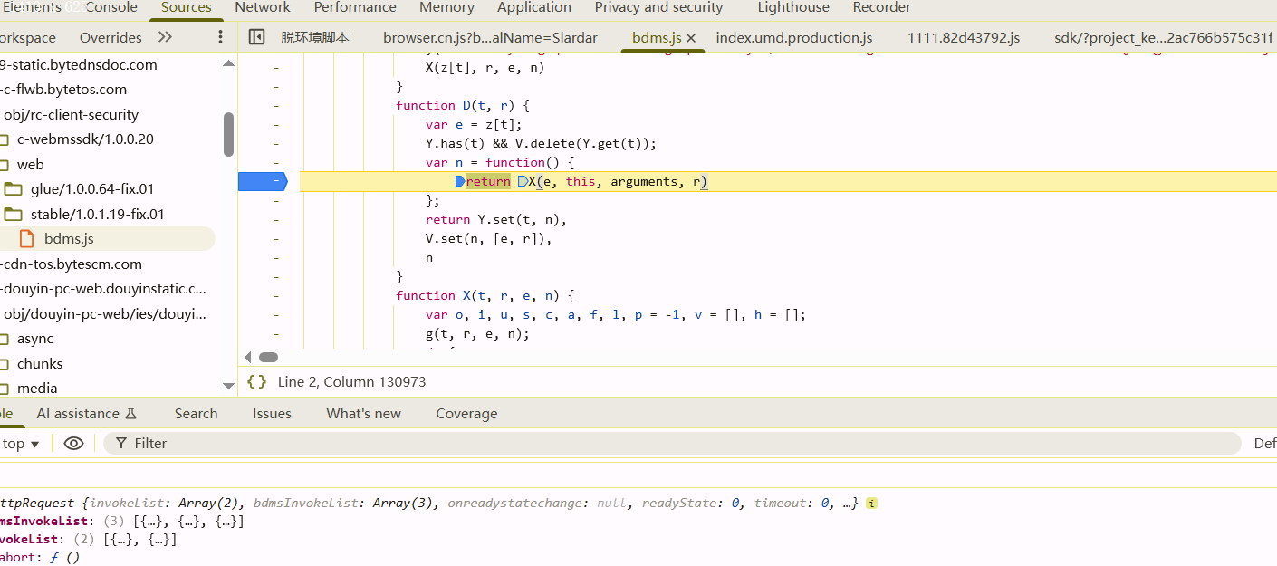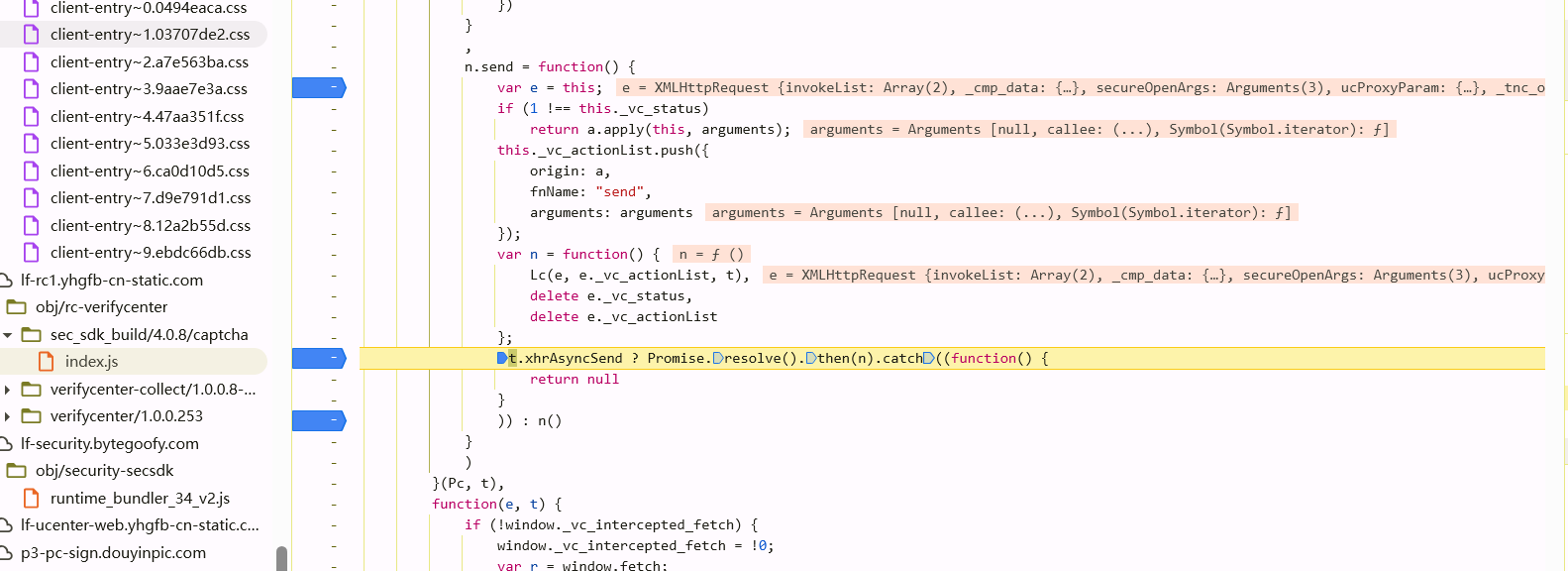然后运行之后调试进入return X(e, this, arguments, r)这里,现在的问题是怎么拿到返回值,通过调试可以发现,当return X(e, this, arguments, r)被调用之后,this(也就是this,XMLHTTPRequest的实例)的secureOpenArgs的值中就会携带了ab参数