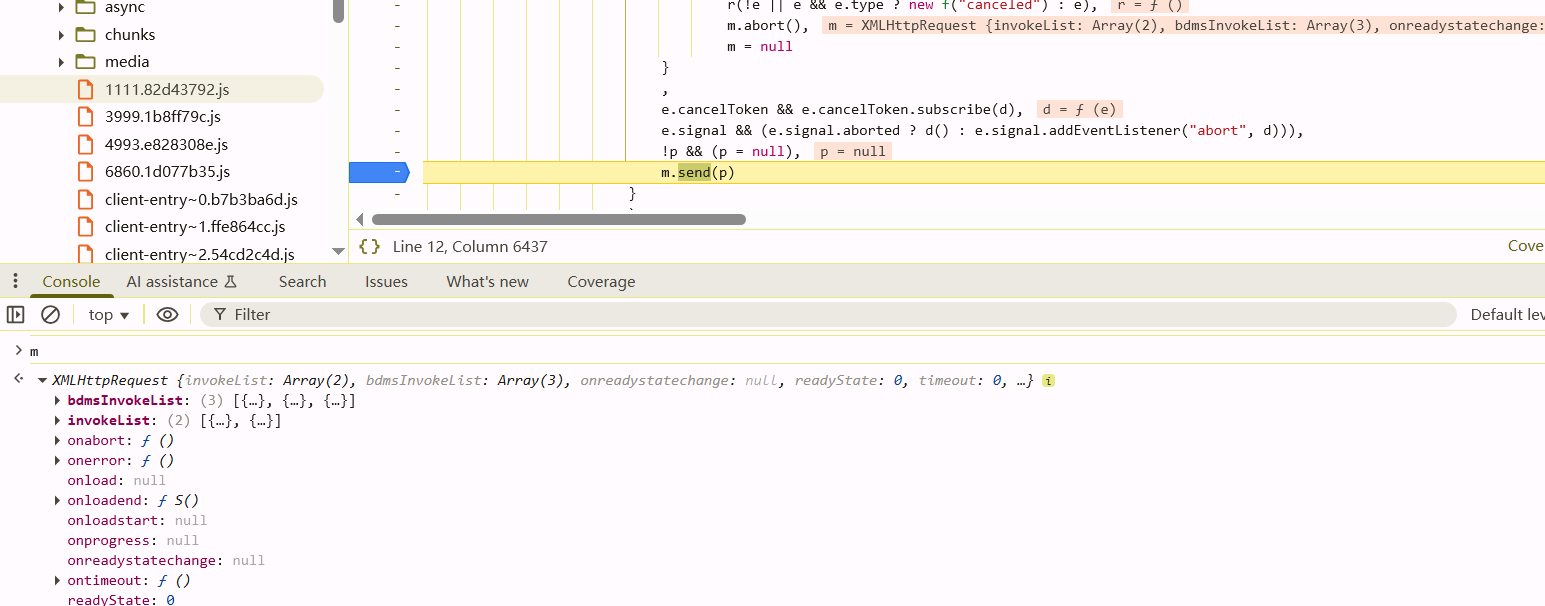 上层函数是m.send(p);,然后调用了n函数,m.send(p) 实际调用的是 n(p),也就是 send = n,而 n 的函数体是调用 X(e, this, arguments, r),最终调用的是 X 函数,X函数里的this就是上下文m,arguments就是p,所以可以通过window.aaa.call(ctx, p)或者window.aaa.apply(ctx, p)来调用,这里的ctx就是this(XMLHTTPrequest的实例)