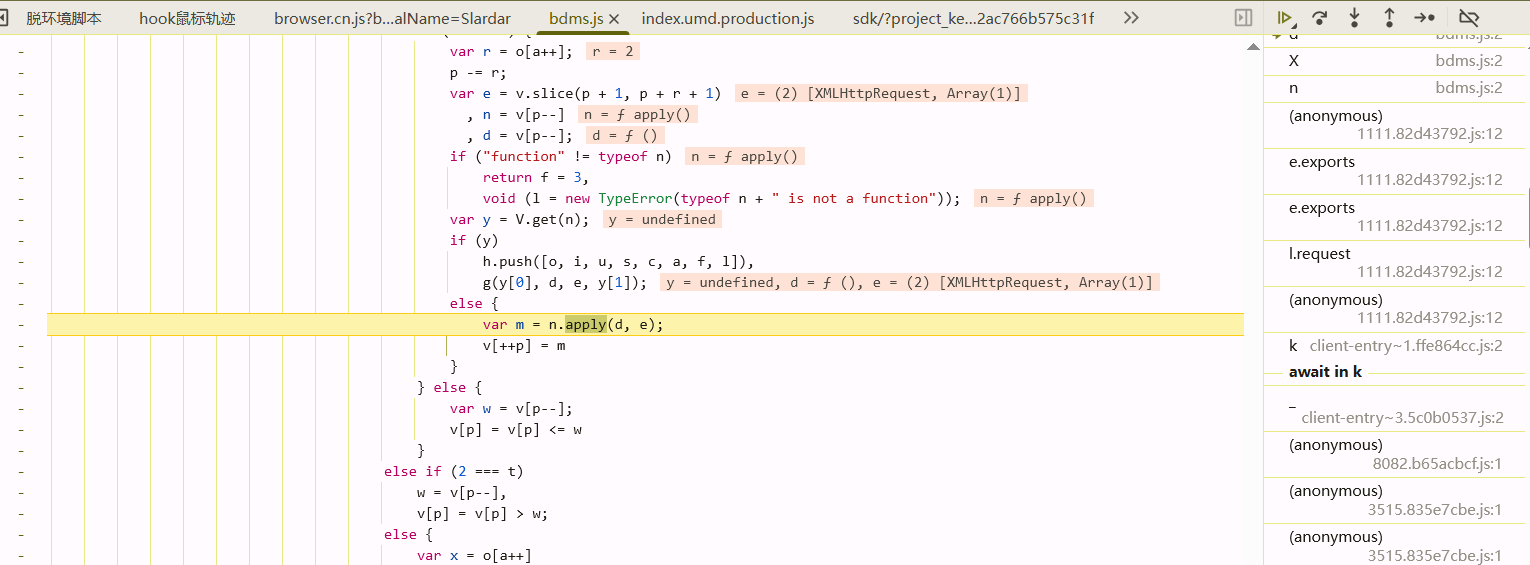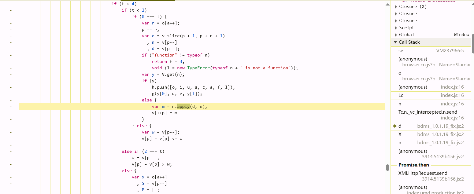 hook之后发现是在var m = n.apply(d, e);这里进行赋值的,当然是在hook之后的函数的上面好几层函数