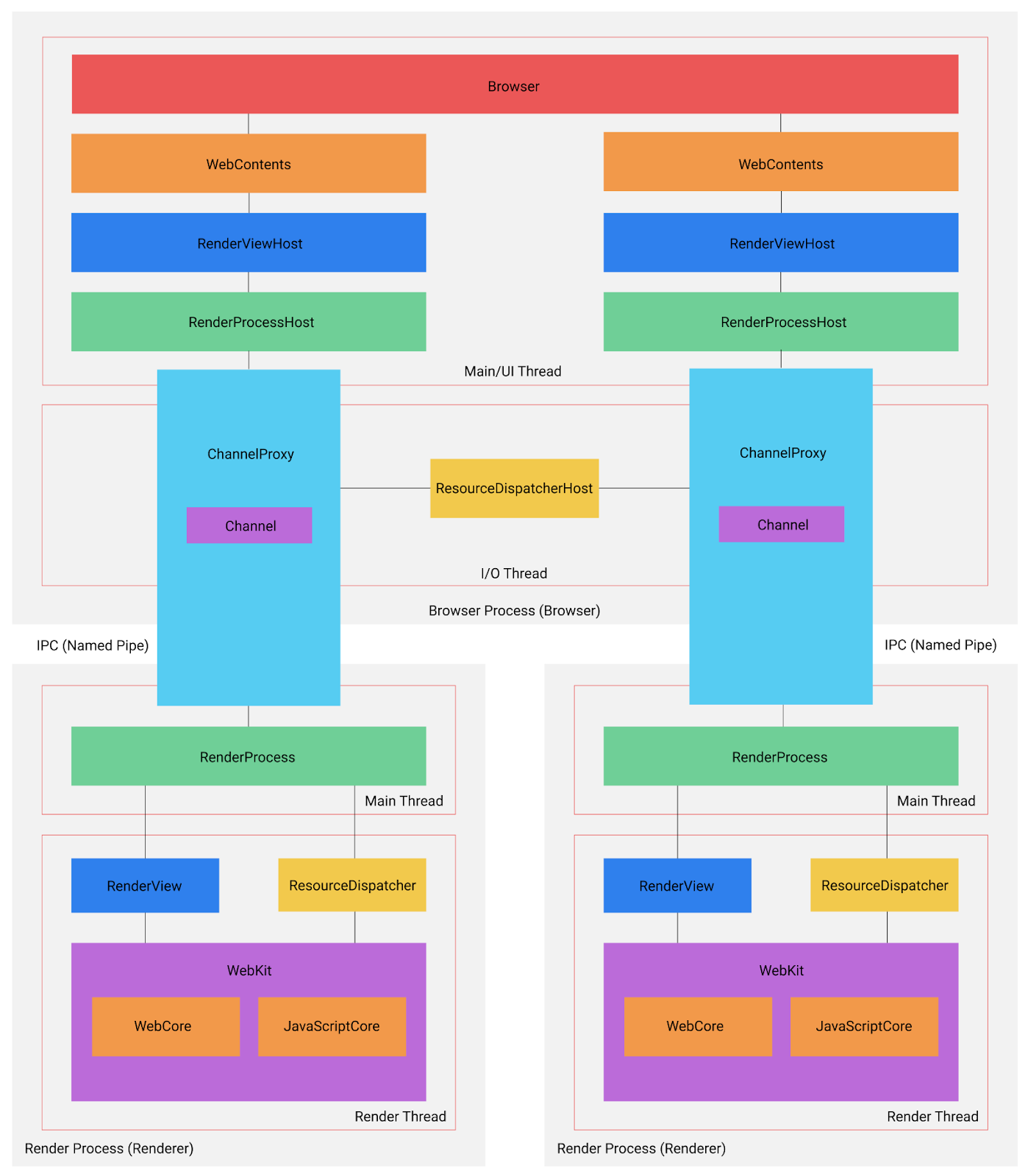 WebContents上层大致有RenderViewHost,和RenderProcessHost两个类(如果细化大概有十几个类名),但RenderViewHost并不是和WebContents 一一对应的关系。