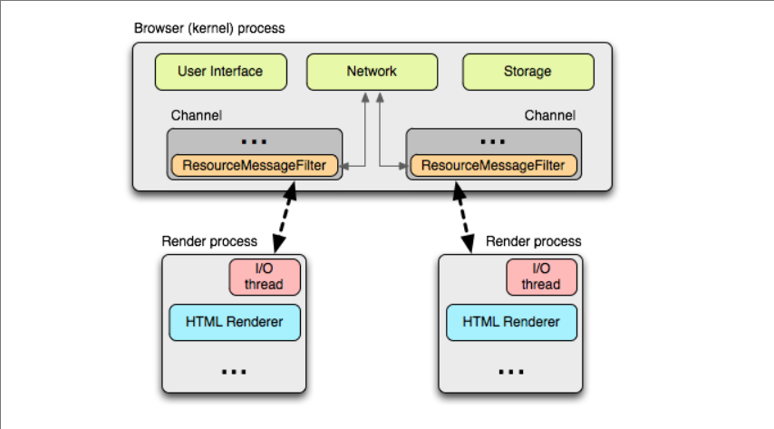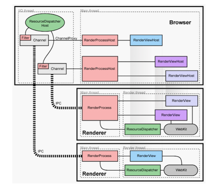 这完全符合平台化的chromium设计,把每个渲染进程,也就是用户(开发者)的脚本运行的环境,打造成一个沙盒,这里所有涉及网络安全和本地存储等 安全风险较大的模块,全部通过IPC发送给Browser进程去处理。而每个渲染进程中又有一些线程,比如IO线程和主线程(上图为HTML Renderer),主线程我们不陌生, IO线程主要与Browser进程通讯。下面会介绍各个线程的作用。